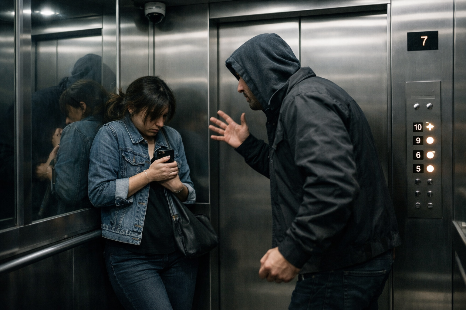 Imagens de segurança registraram o momento da violência dentro do elevador. As agressões só foram interrompidas após a intervenção de uma terceira pessoa.