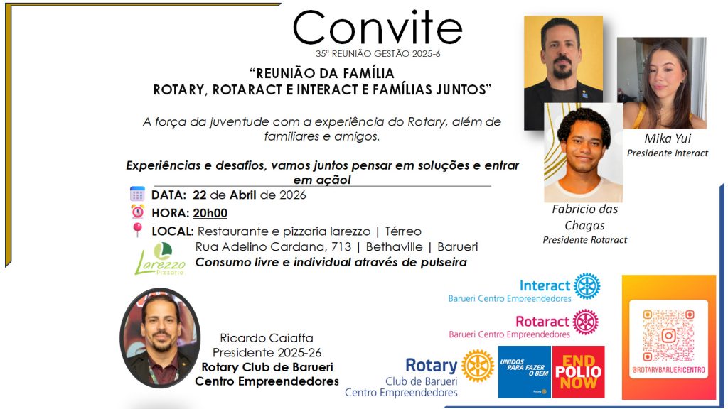 O Rotary Club de Barueri Centro Empreendedores realiza no dia 22 de abril a 35ª reunião da gestão 2025-26, com foco na integração entre gerações e no fortalecimento do protagonismo jovem dentro do movimento rotário.