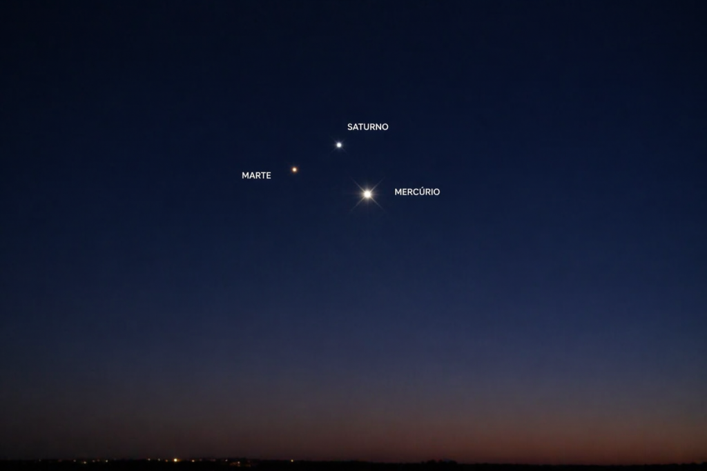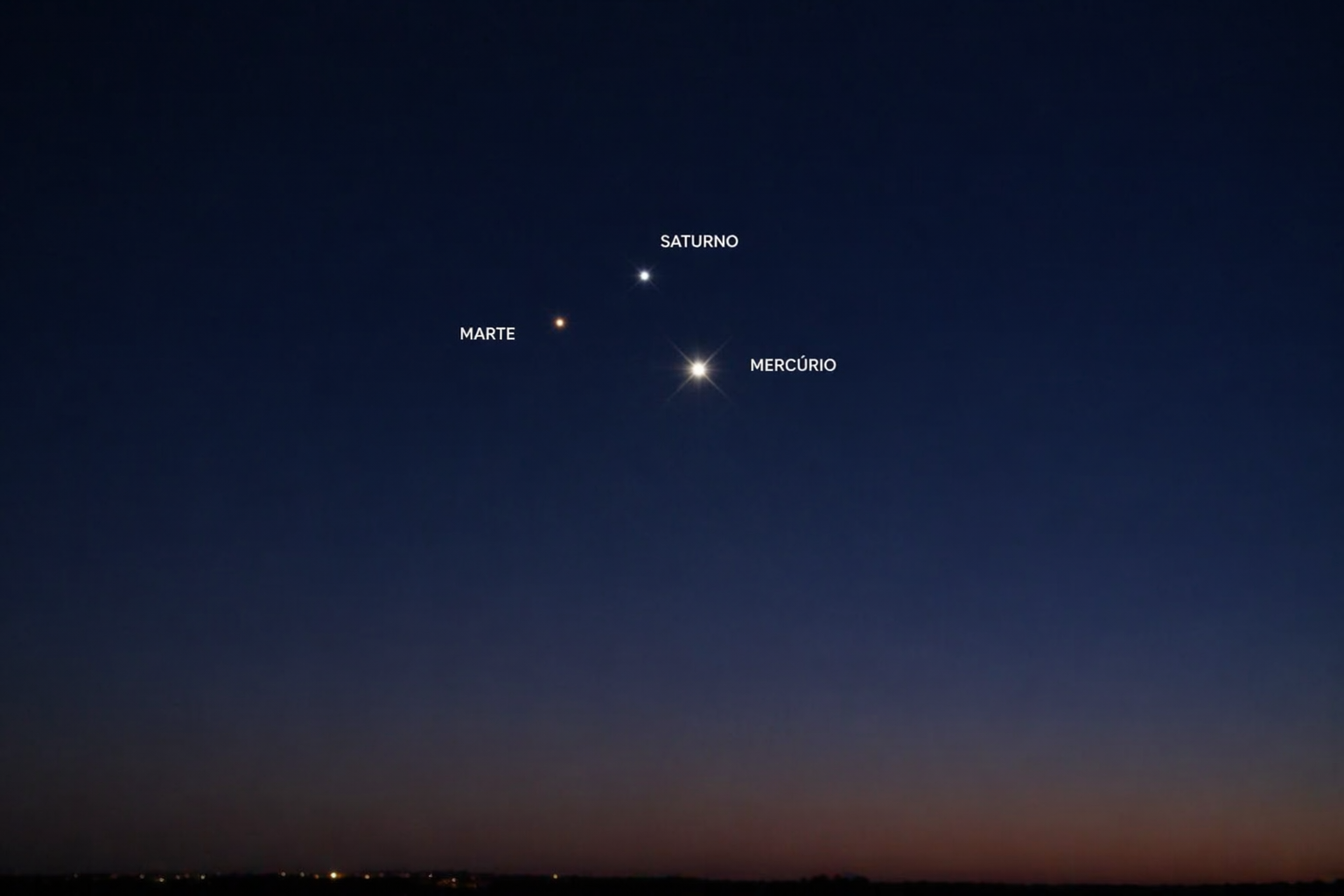 O fenômeno ocorre quando três planetas aparecem próximos no céu, formando um desenho triangular visível a olho nu, dependendo das condições climáticas.